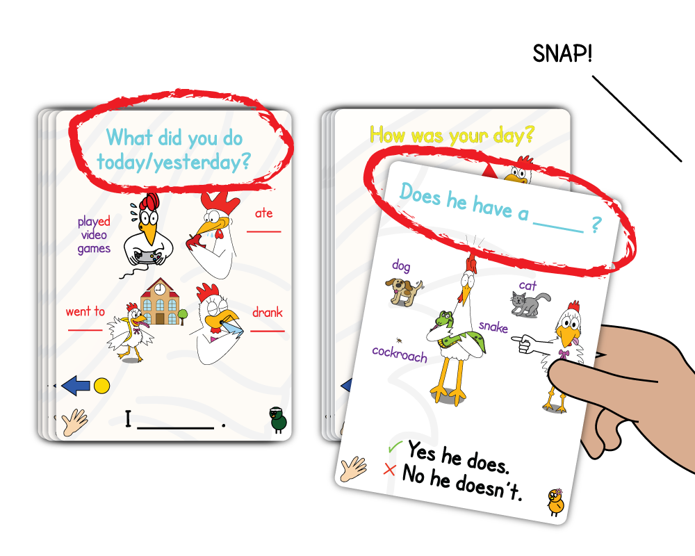 - For added challenge or consistency, colored chicks in the corner of each card can also trigger a ‘snap’ if their colors match.